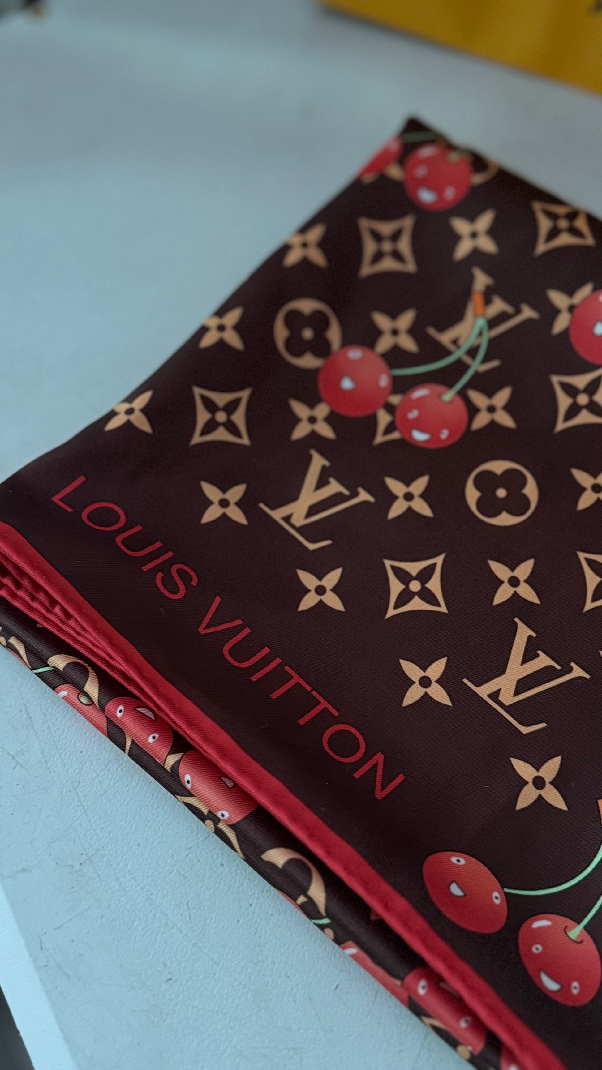 وشاح لوي فويتون 90*90 بثلاث الوان عليه كرز باللون الاحمر